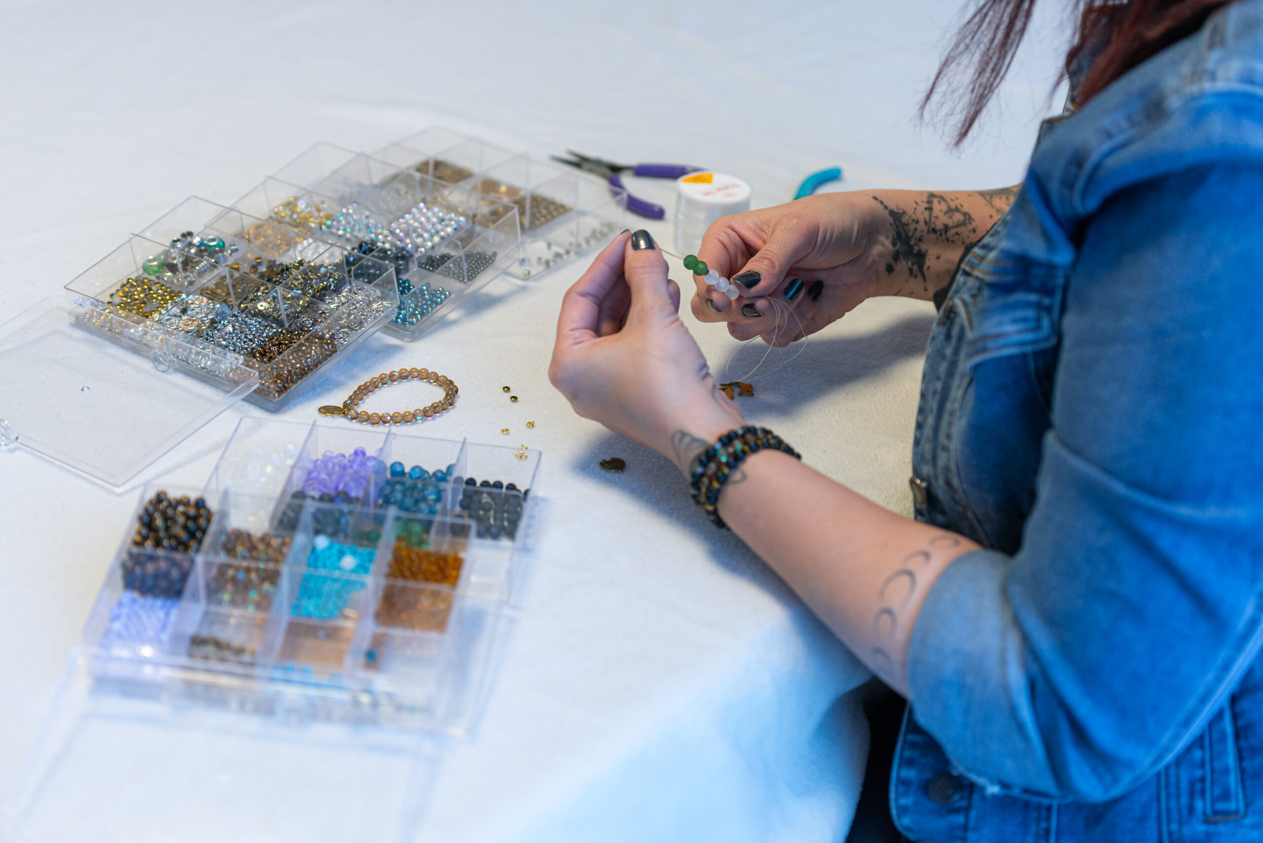 Für meine Armbänder verwende ich hauptsächlich einen dehnbaren Nylonfaden, den ich doppelt einziehe. Das macht ihn sehr strapazierfähig und formstabil. Je nach Perlenart setze ich unterschiedliche Fadengrößen ein. Bei metallischen Elementen arbeite ich vor allem mit Edelstahl und Hämatit sowie ausgewählten Spacern, die sich bewährt haben.